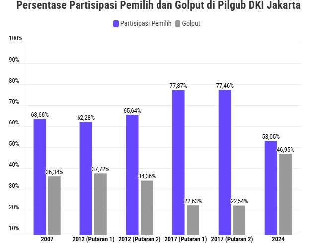 Menurut catatan yang dikutip melalui kumparan, angka yang tidak memilih pada Pilgub Jakarta 2024 adalah yang tertinggi dalam sejarah. Pilgub Jakarta sendiri telah dipilih secara langsung oleh warga sejak tahun 2007.