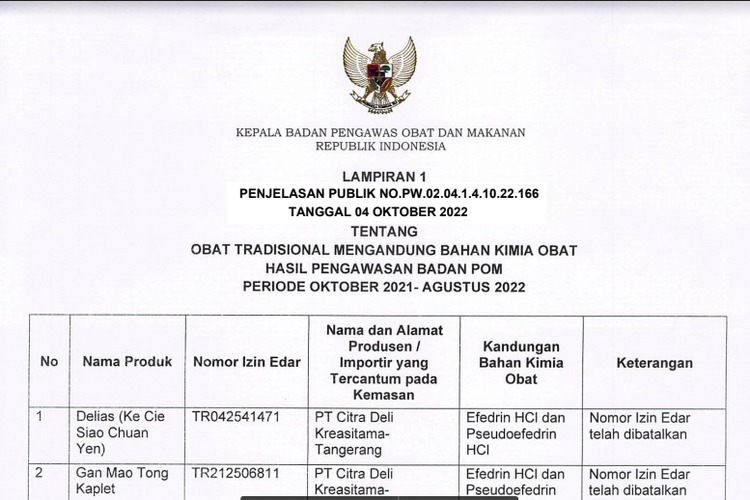 ” Disusul obat tradisional memiliki BKO Efedrin serta Pseudoefedrin HCl dengan klaim yang digunakan secara tidak pas buat pengobatan serta pencegahan pada masa pandemi Covid- 19,” tutur Reri kepada Kompas. com, Sabtu( 15/ 10/ 2022).