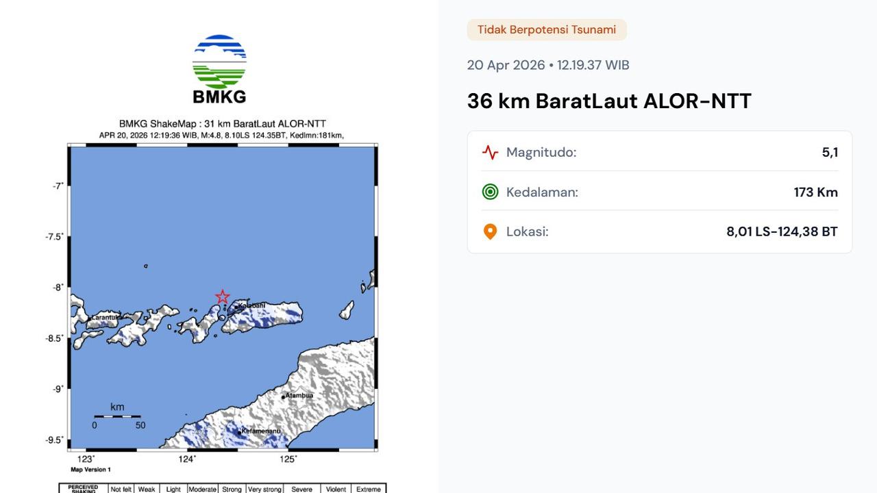 Pusat gempa terletak sekitar 36 kilometer di barat laut Alor, Nusa Tenggara Timur.